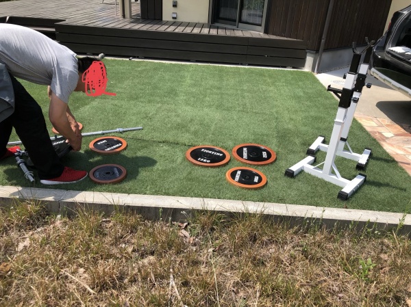 その後、僕が個人所有してるベンチプレス台とバーベルセットをプレゼント!